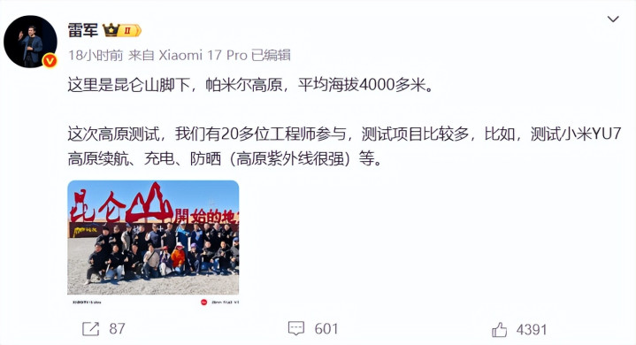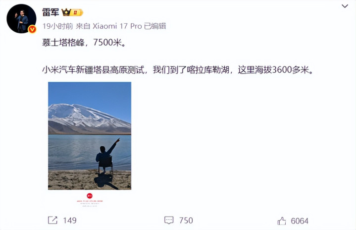 10月11日下午2点50分,雷军在微博上晒出慕士塔格峰的照片,提到在3600多米的喀拉库勒湖进行测试,随后补充说明“帕米尔高原平均海拔4000多米,20多个工程师在测YU7”。